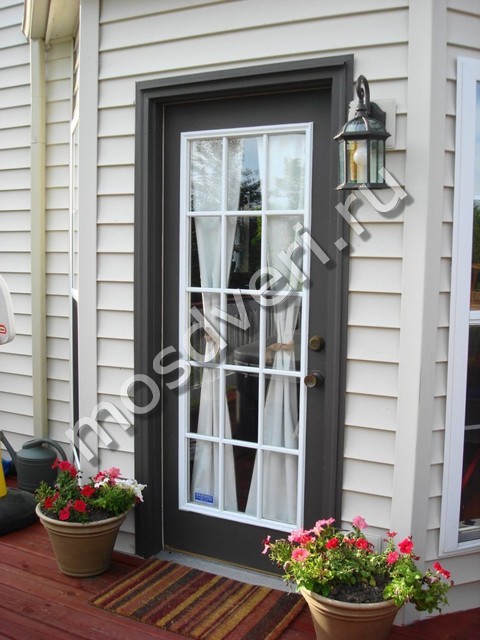Вставки уличных входных дверей со стеклом защищены железной декоративной ковкой или литьем в виде художественной решетки.